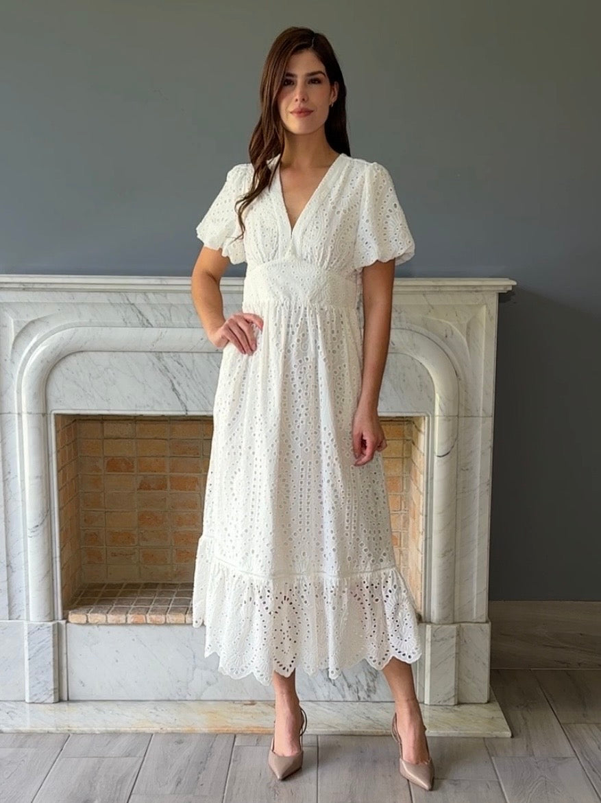 Vestido midi en blanco con manga corta y escote en v. Destaca por su delicado diseño bordado que añade movimiento a cada paso. Perfecto para ocasiones especiales, eventos o para lucir impecable en tu día a día. La tela fluida proporciona comodidad sin comprometer el estilo.
