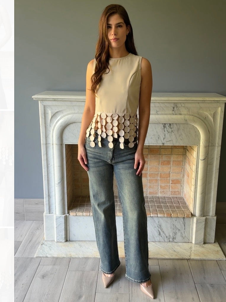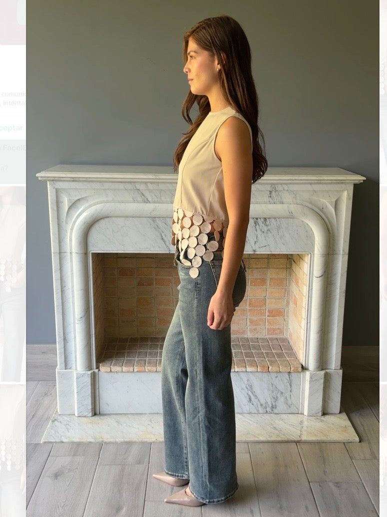Blusa beige sin mangas con un diseño elegante de círculos descendentes. Perfecta para crear looks versátiles en cualquier ocasión. Su corte moderno y detalles geométricos la convierten en una pieza imprescindible para tu guardarropa.