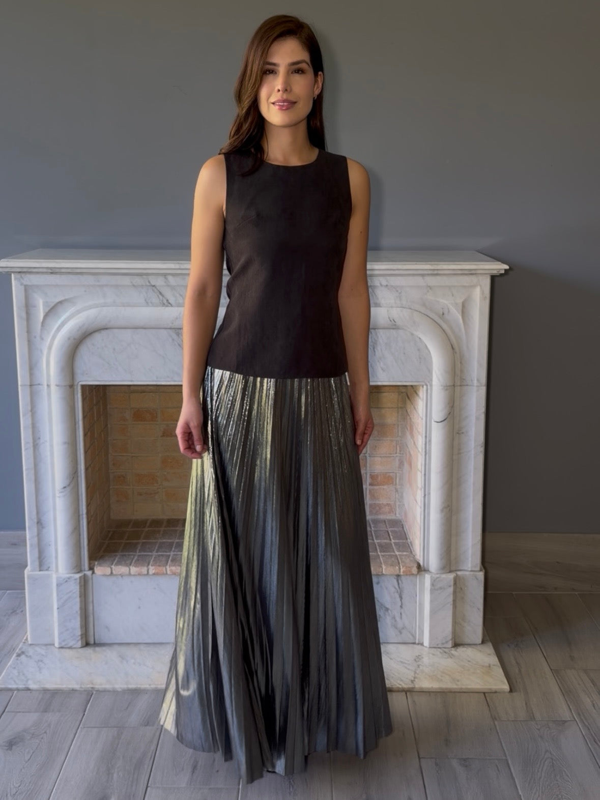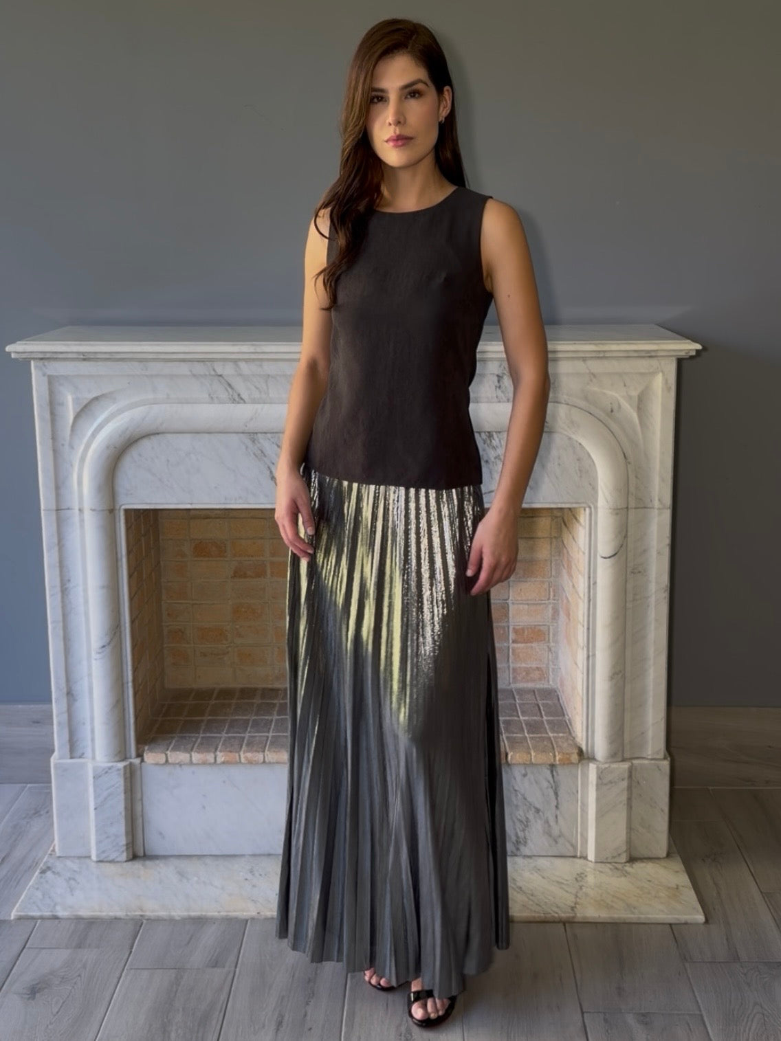 Blusa negra confeccionada en material tipo ante . Sin mangas, es perfecta para lucir tus brazos mientras mantienes un look sofisticado y versátil. Ideal para combinar con jeans, faldas o pantalones, esta pieza esencial se adapta a cualquier ocasión, desde casual hasta más formal. Su textura suave y ajuste al cuerpo la convierten en una prenda imprescindible en tu guardarropa.