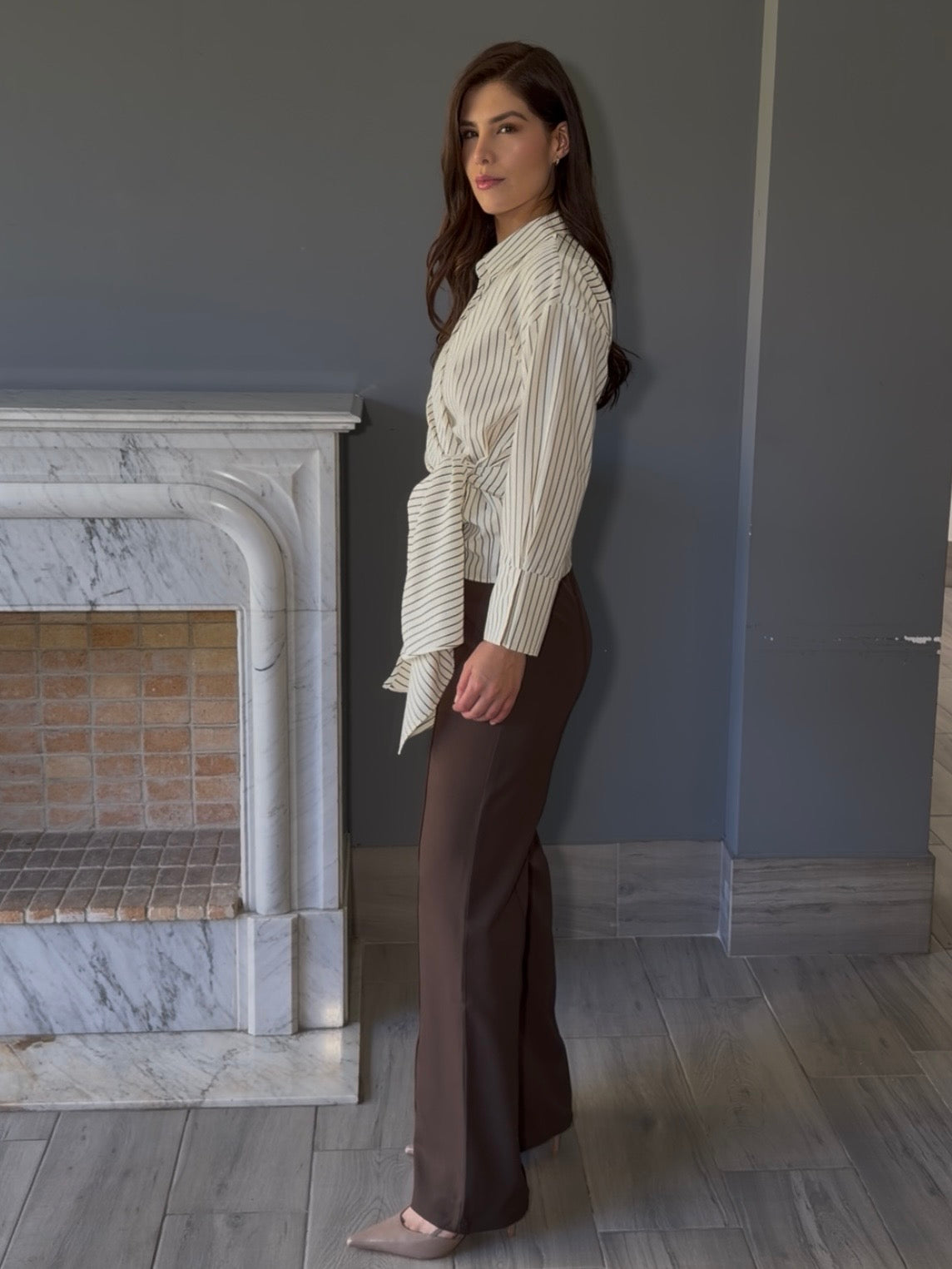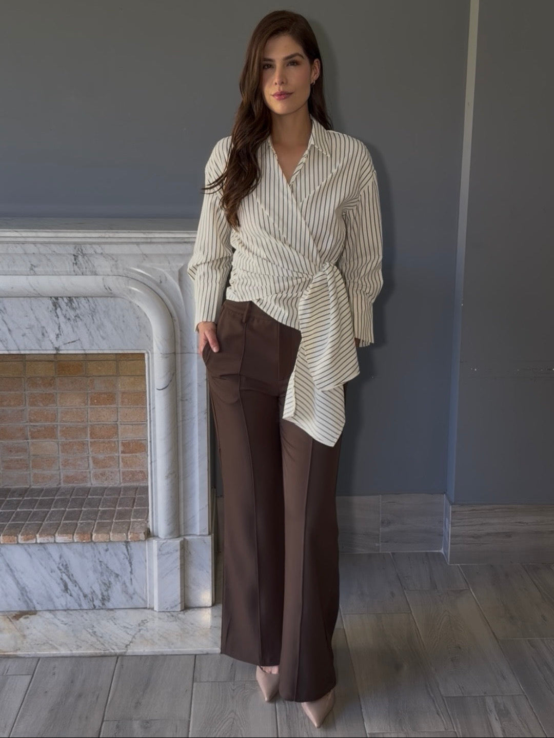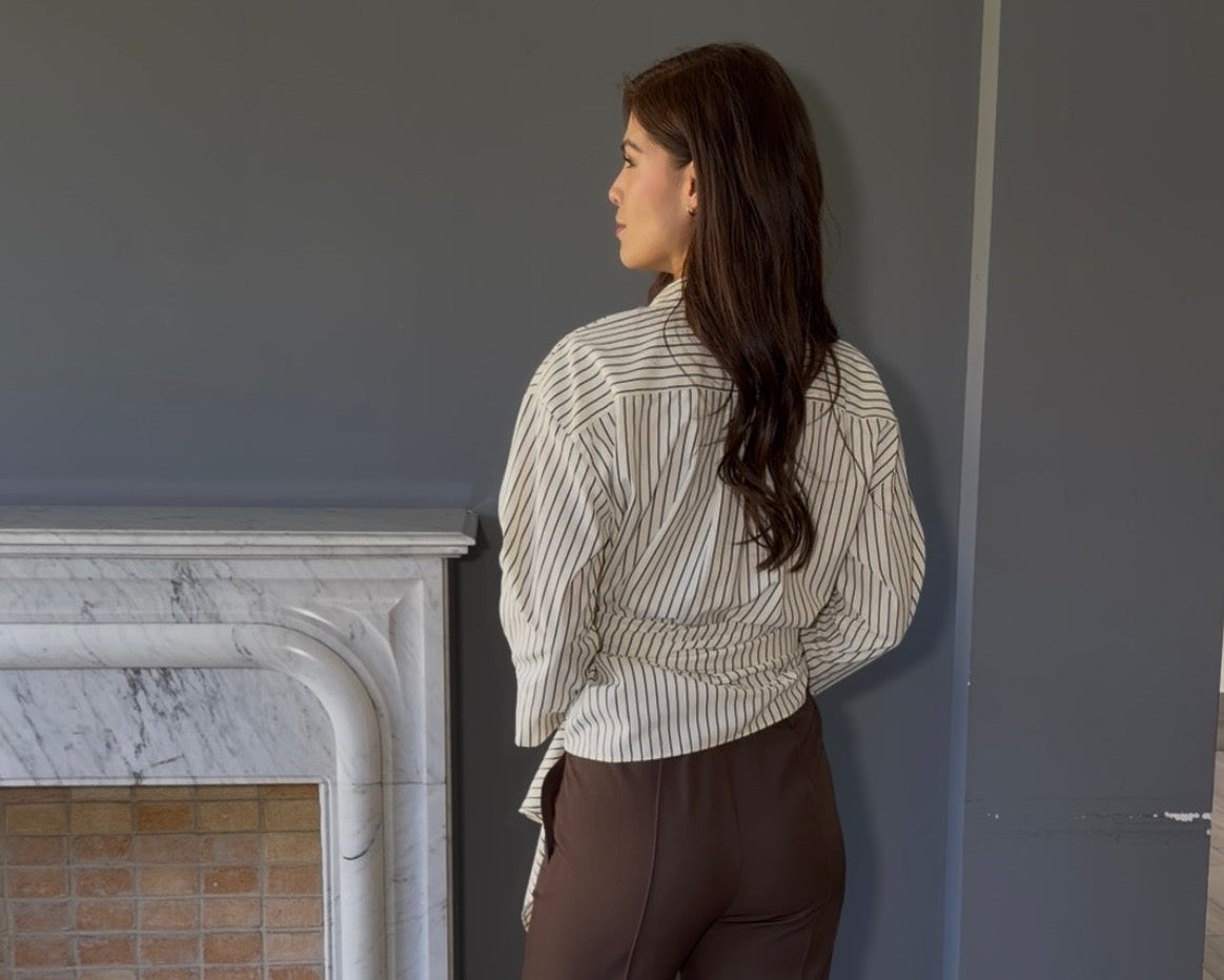 Blusa tipo camisa confeccionada en tela a rayas con manga larga y ajustable. Su diseño versátil permite adaptarla a tu figura de manera cómoda y elegante. Perfecta para crear looks casuales o semi-formales, combina fácilmente con jeans, faldas o pantalones.