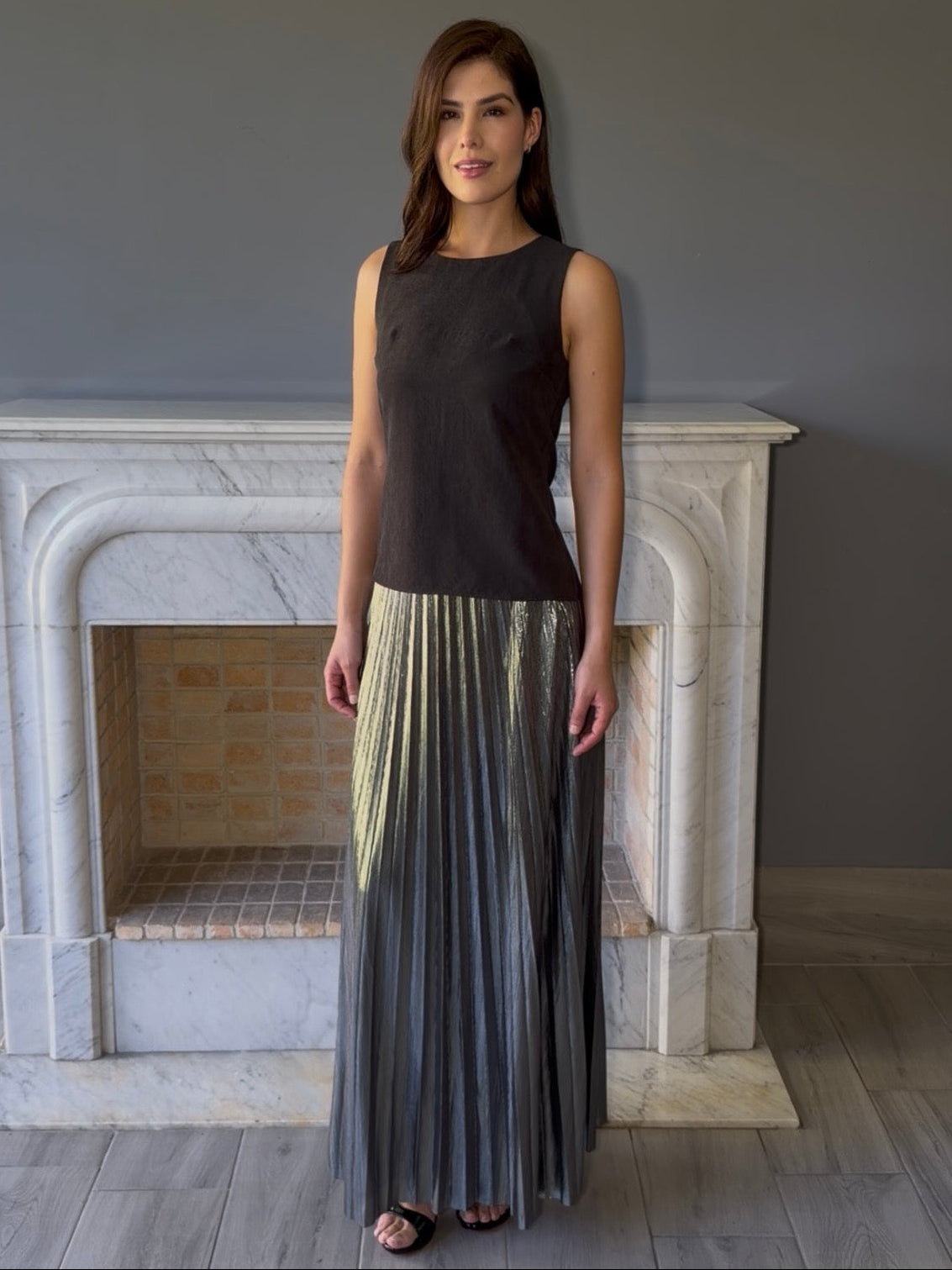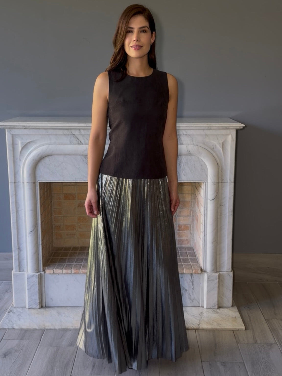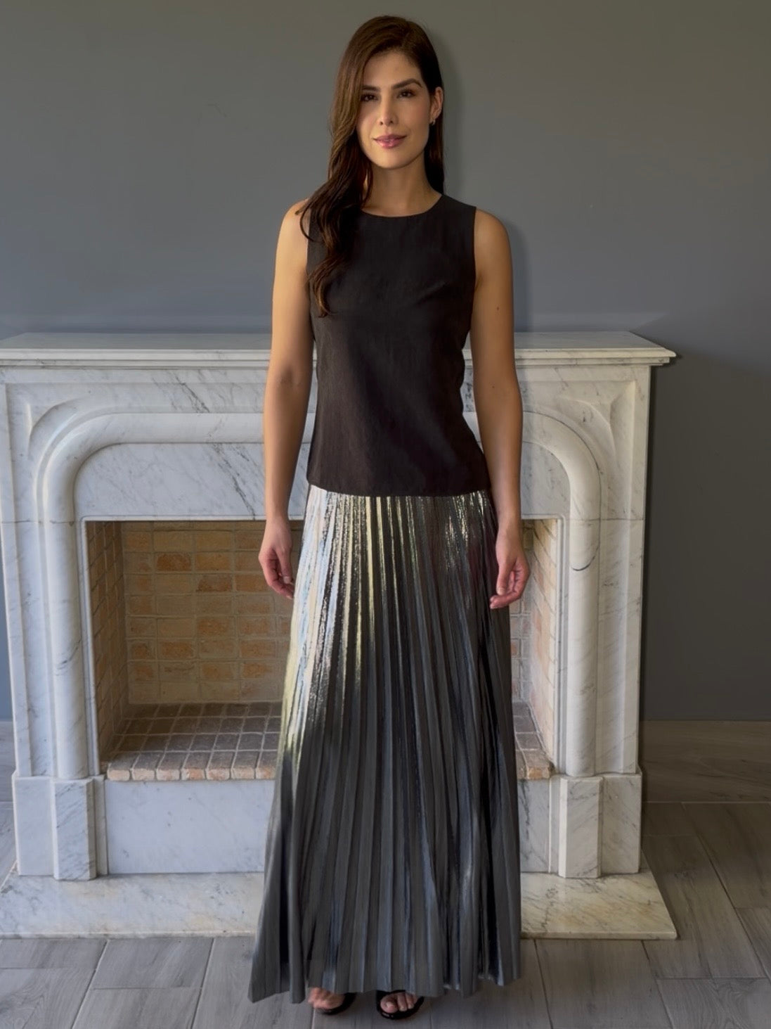 Falda larga plisada en tela metalizada plateada que captura la luz con cada movimiento. Su diseño plisado crea un efecto dinámico y elegante, perfecto para ocasiones especiales o looks de noche. La tela con acabado metálico le da un toque sofisticado y moderno. Ideal para quienes buscan destacar con estilo y brillo.