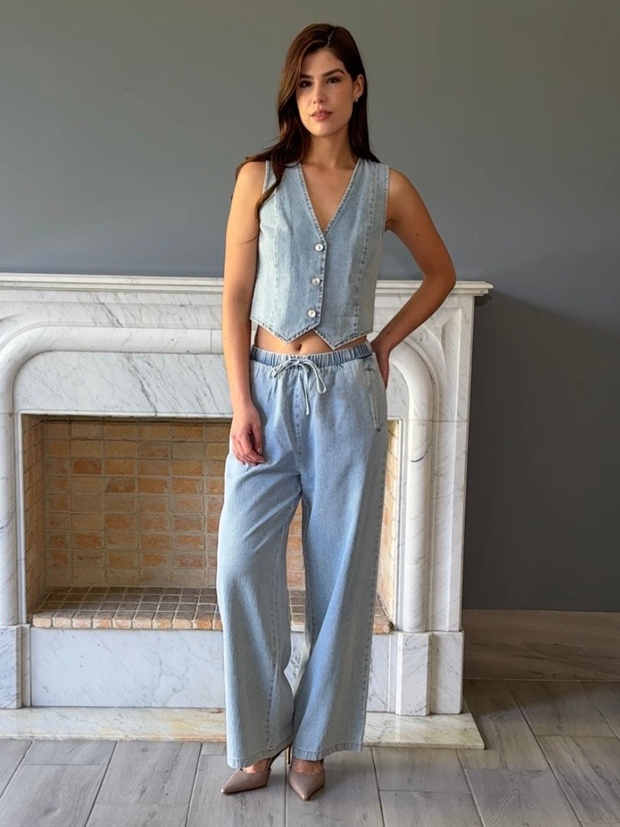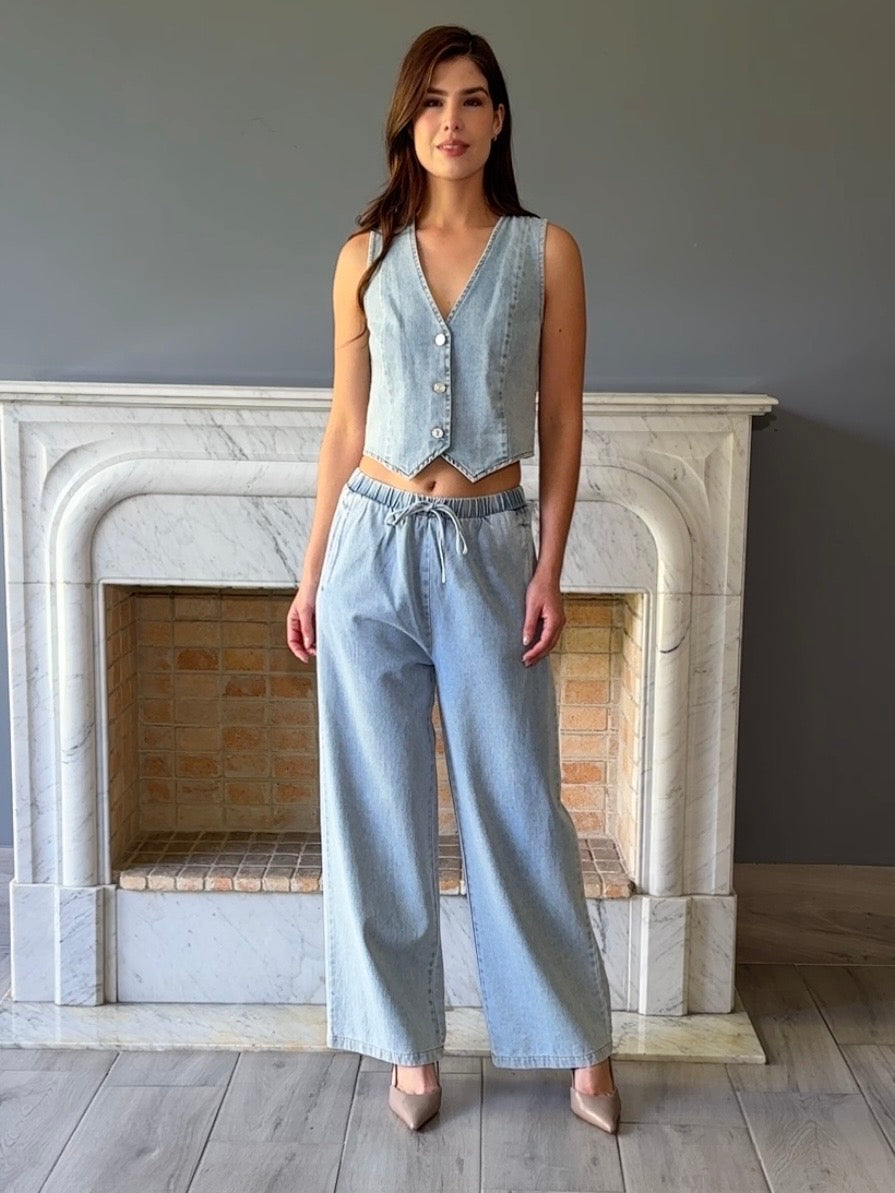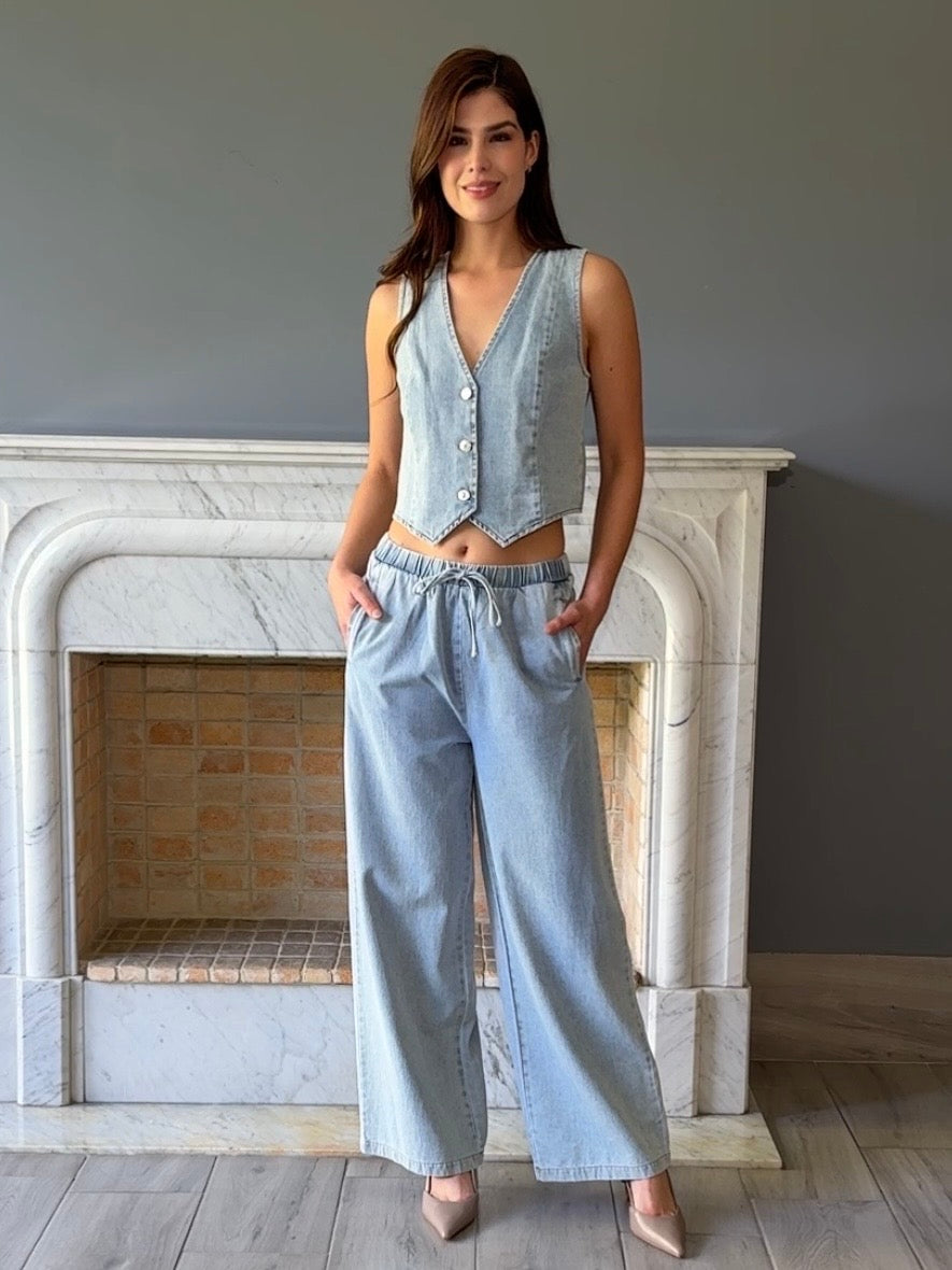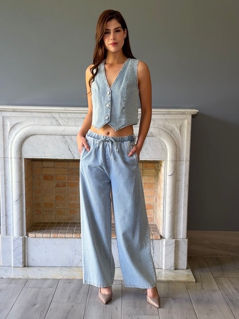 Conjunto versátil de mezclilla que combina un chaleco con pantalón clásico. Perfecto para crear looks casuales o semi-formales con facilidad. La mezclilla de calidad garantiza durabilidad y comodidad en cada uso. Ideal para quienes buscan prendas funcionales que se adapten a diferentes ocasiones.