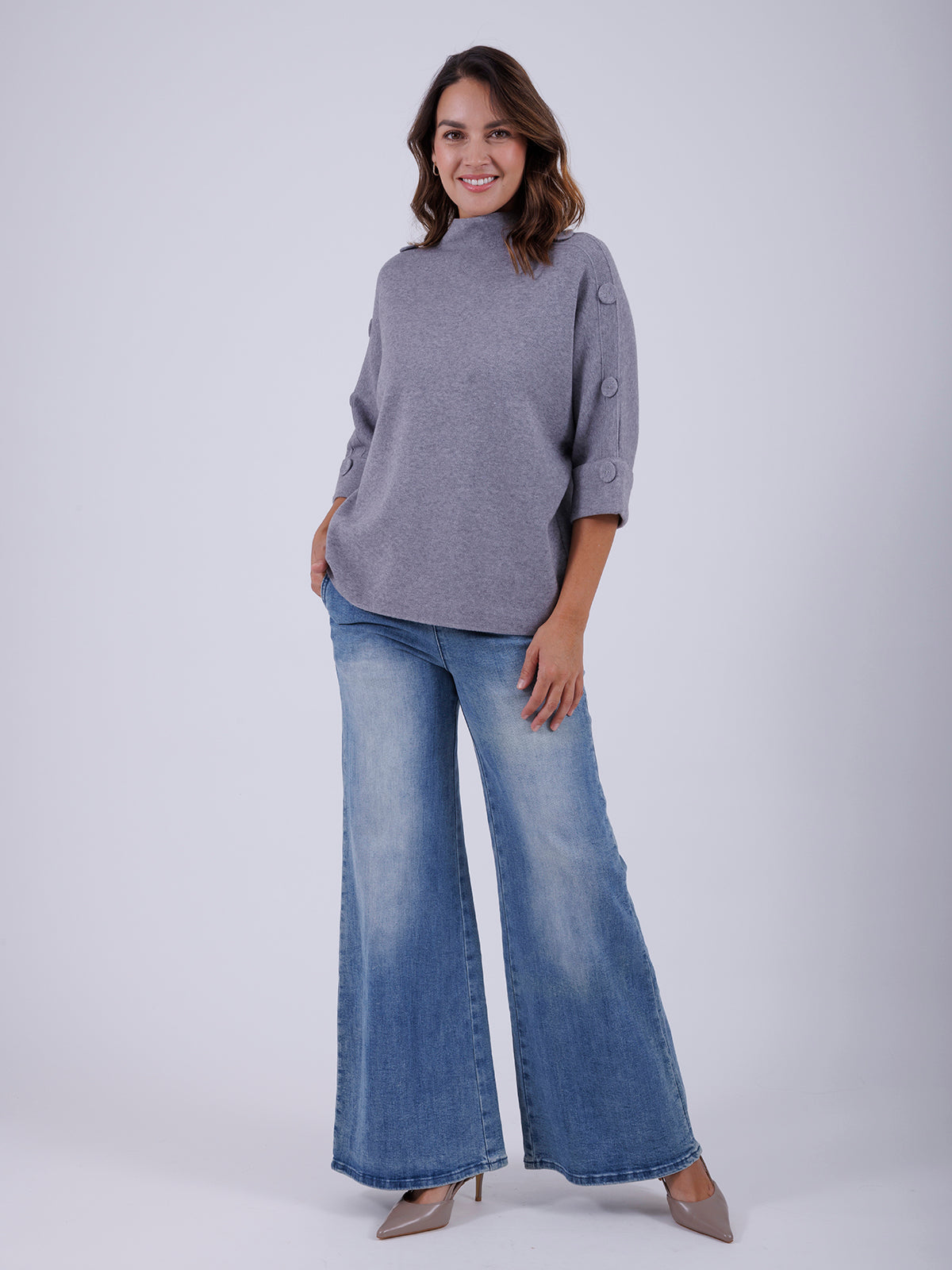Suéter versátil en gris que combina comodidad y estilo. Destaca por su cuello alto que proporciona calidez y un toque sofisticado, mientras que las mangas tres cuartos ofrecen una silueta moderna y práctica. Los botones decorativos en las mangas añaden un detalle funcional y elegante que lo diferencia.