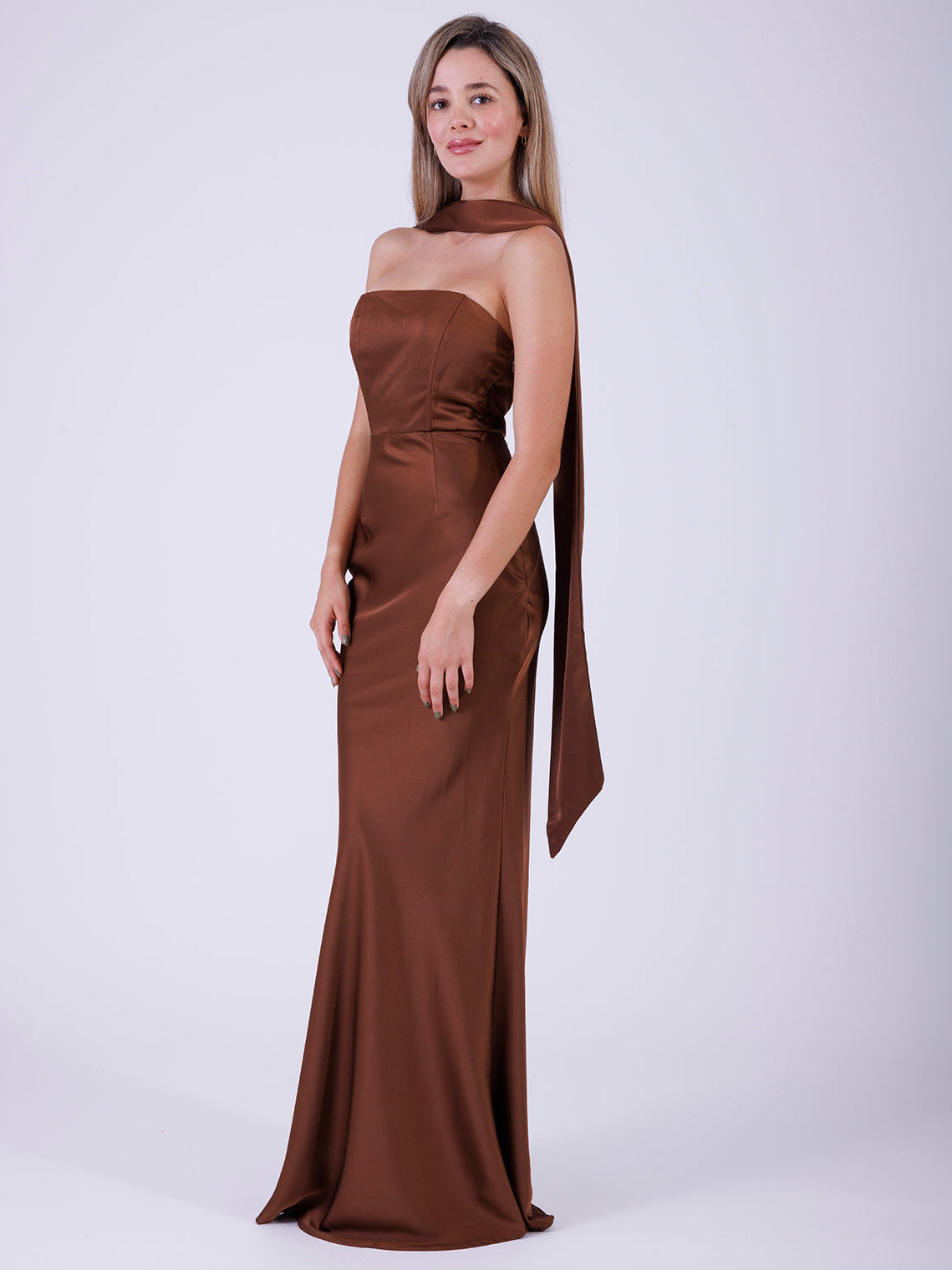 Este vestido café tipo satín cuenta con un diseño estraple ajustado que realza la figura. Su versatilidad permite que lo uses con o sin listón en el cuello, adaptándose a distintos estilos y ocasiones. Ideal para lucir elegante