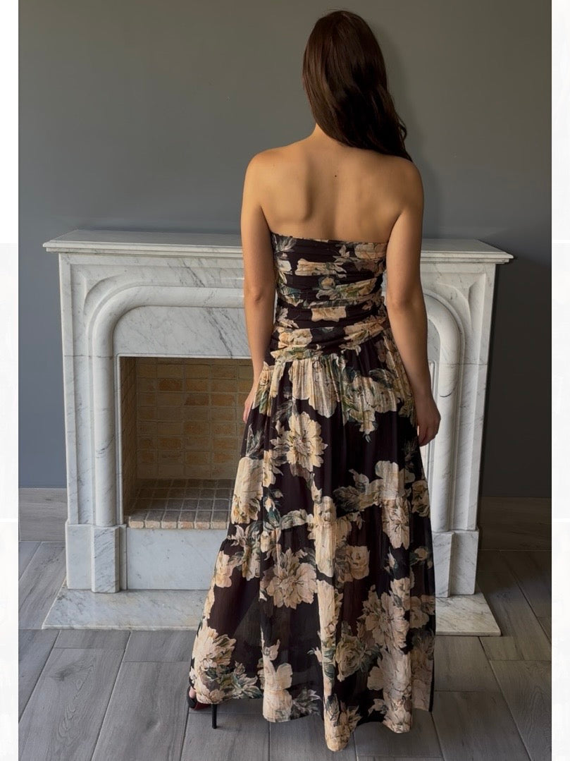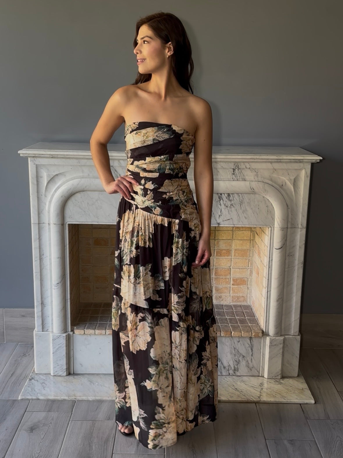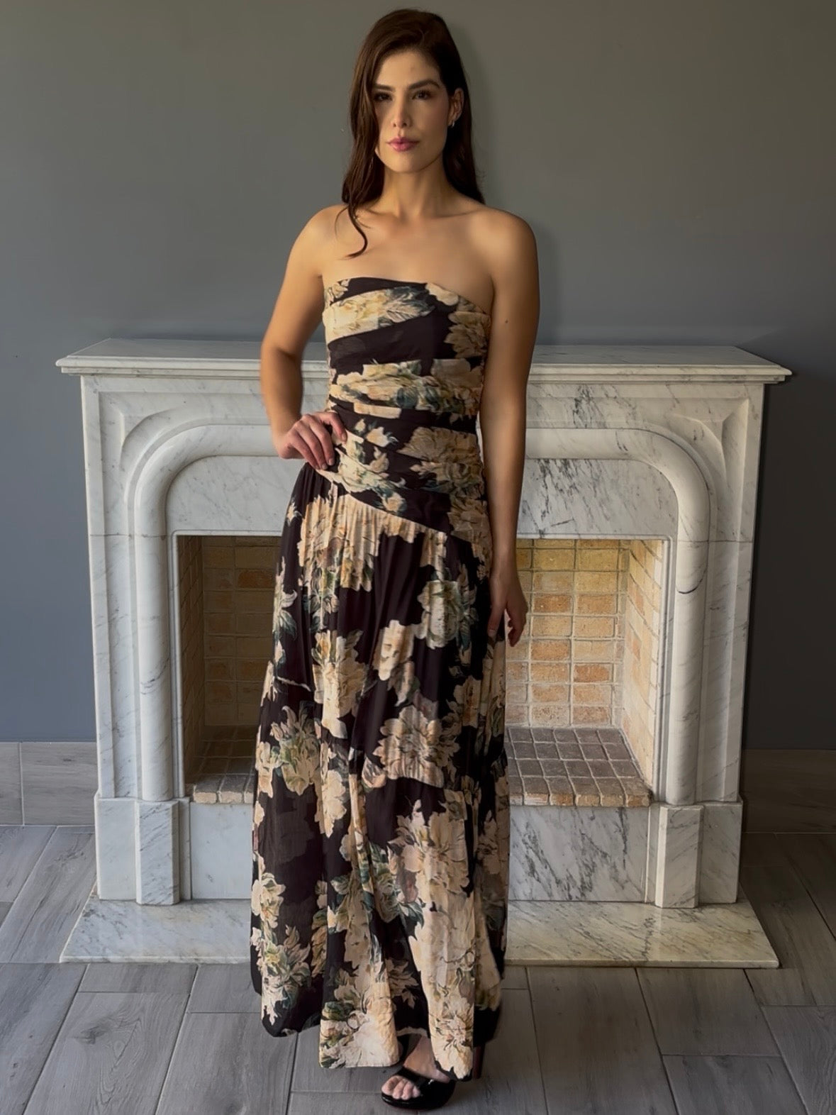 Este vestido estraple con estampado de flores ofrece un diseño fresco y femenino. Su corte cómodo y ligero permite libertad de movimiento. Perfecto para combinar con accesorios sencillos y lograr un look elegante.