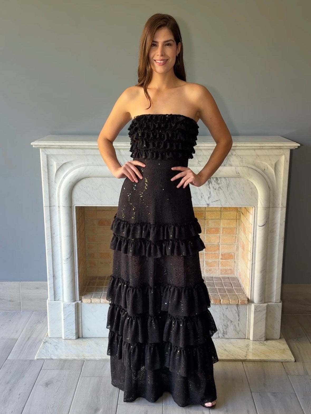 Descubre la sofisticación en cada detalle con este vestido largo de encaje en negro que combina elegancia con un toque contemporáneo. El diseño strapless realza tu figura de manera favorecedora. Perfecto para eventos especiales