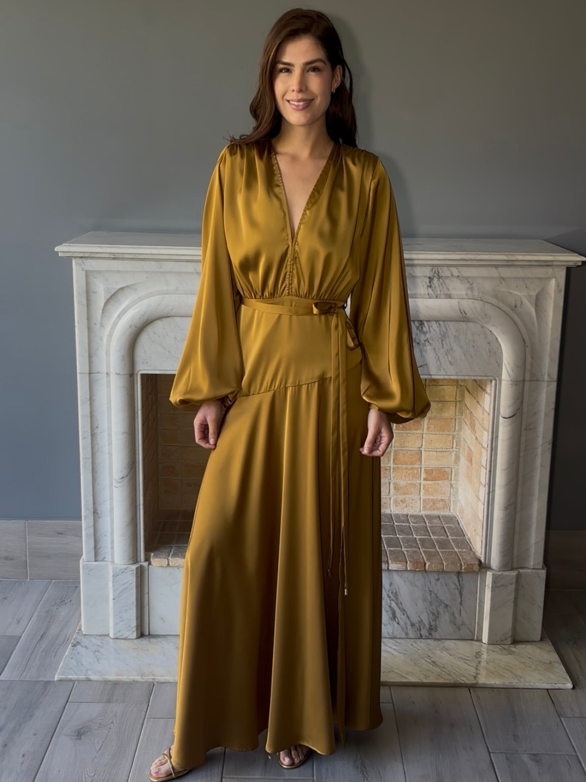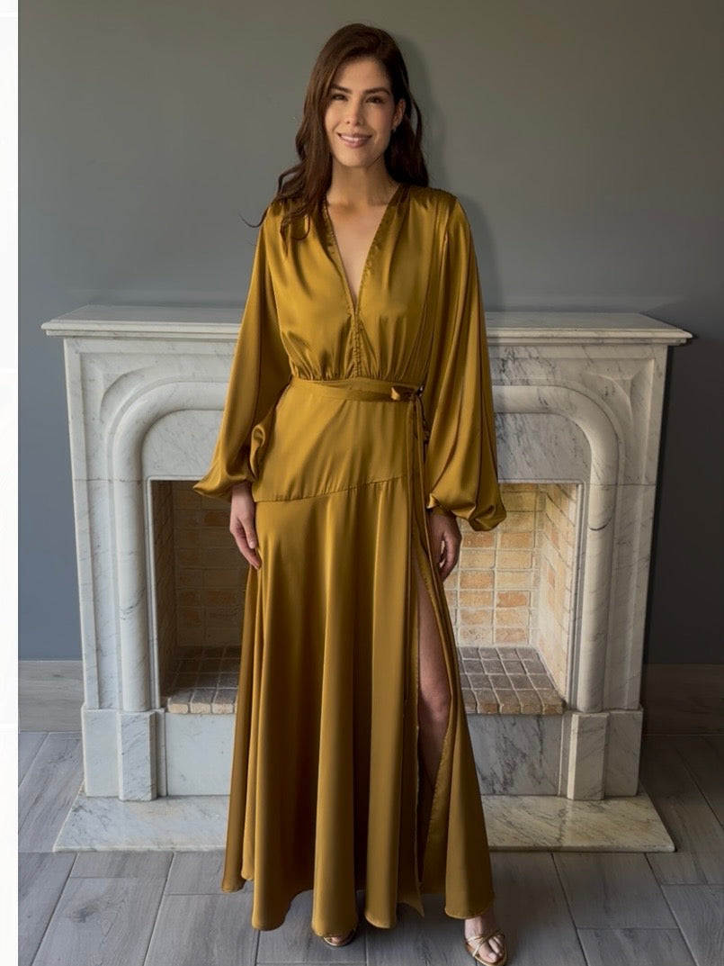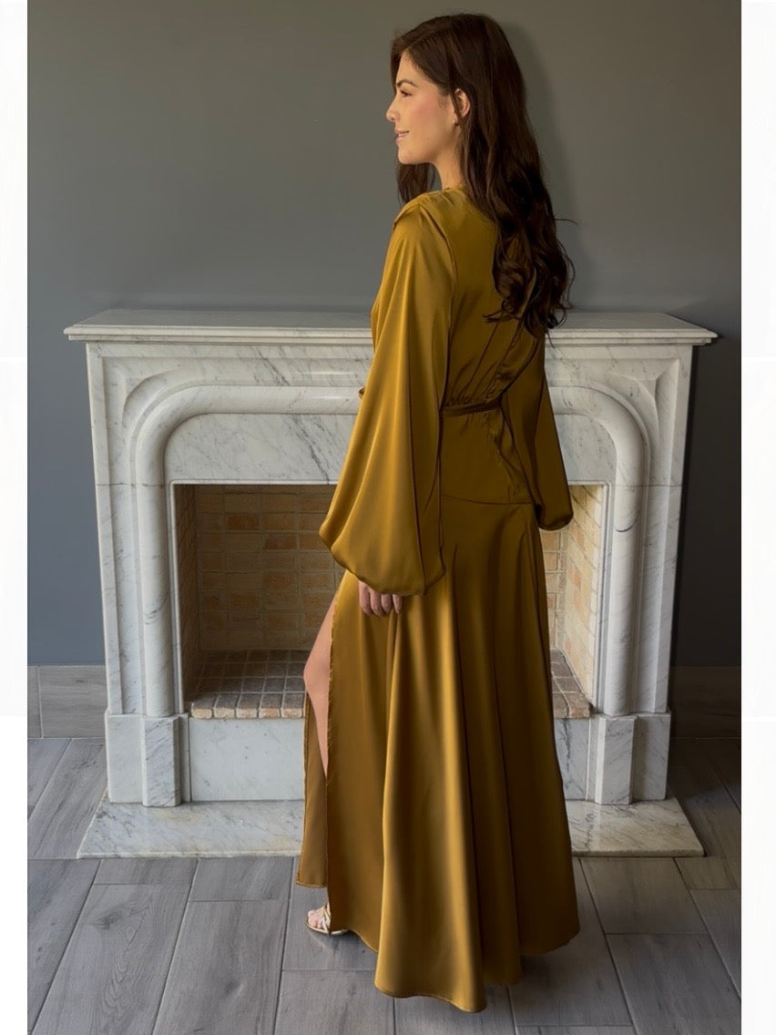 Elegante vestido largo en tono mostaza tipo satín suave que realza la figura. Diseño sofisticado con manga larga y escote en V que combina comodidad con estilo. Perfecto para ocasiones especiales, cenas o eventos donde desees lucir radiante.