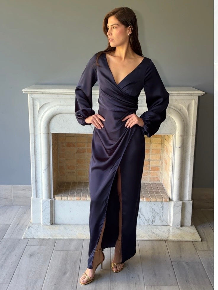 Este vestido manga larga tipo satín en color rosa combina elegancia y sensualidad con su abertura en la pierna, ideal para ocasiones especiales. Su tela satinada ofrece un acabado suave y brillante que realza la figura, proporcionando comodidad y estilo en cada movimiento.