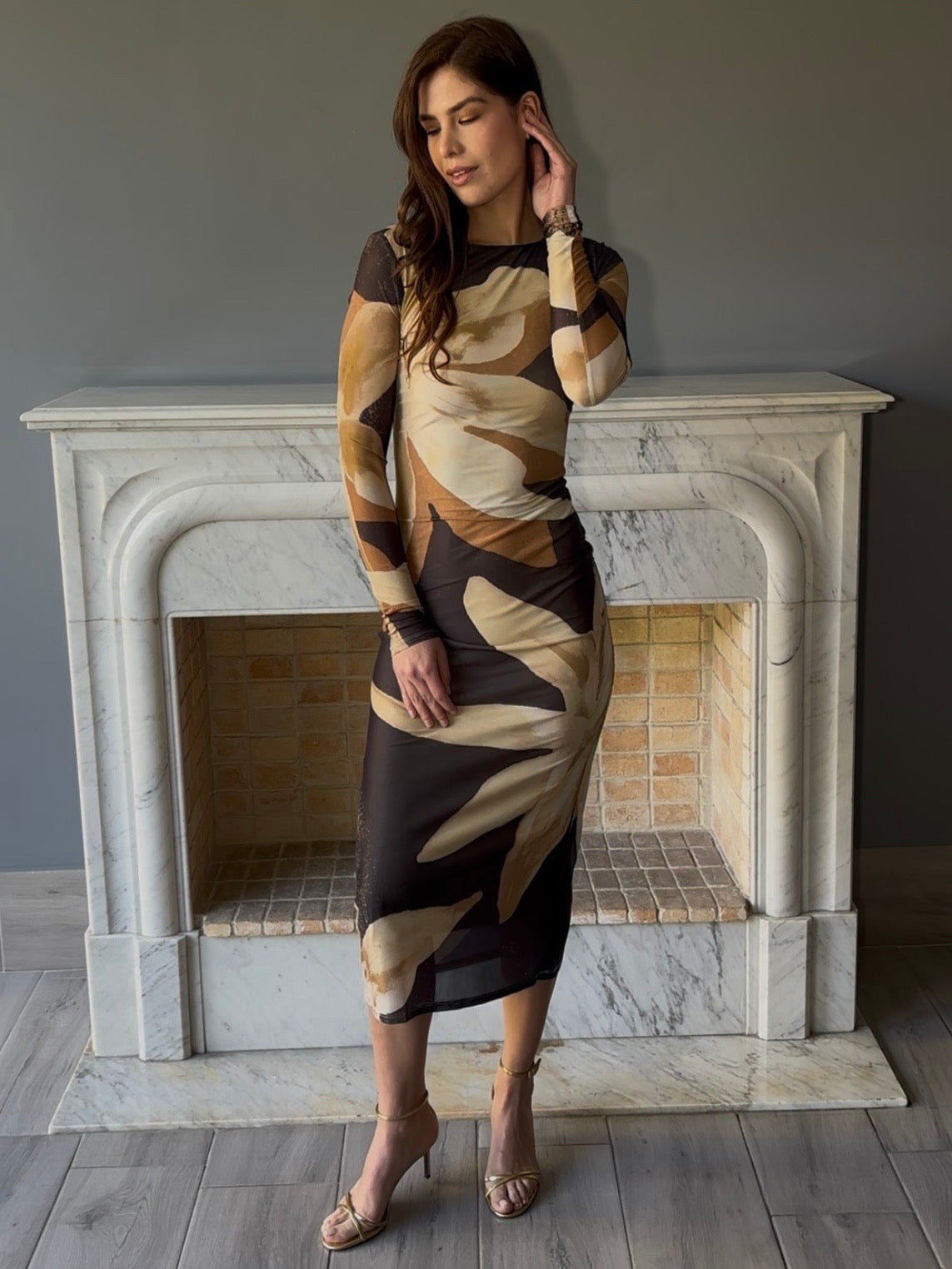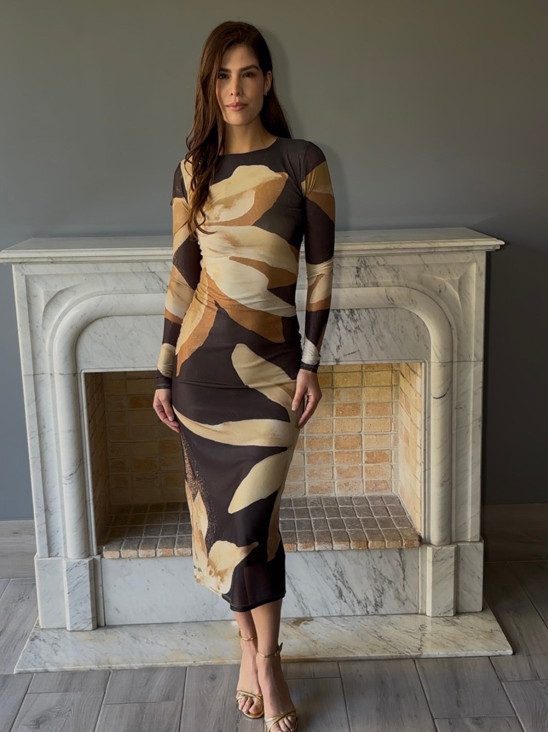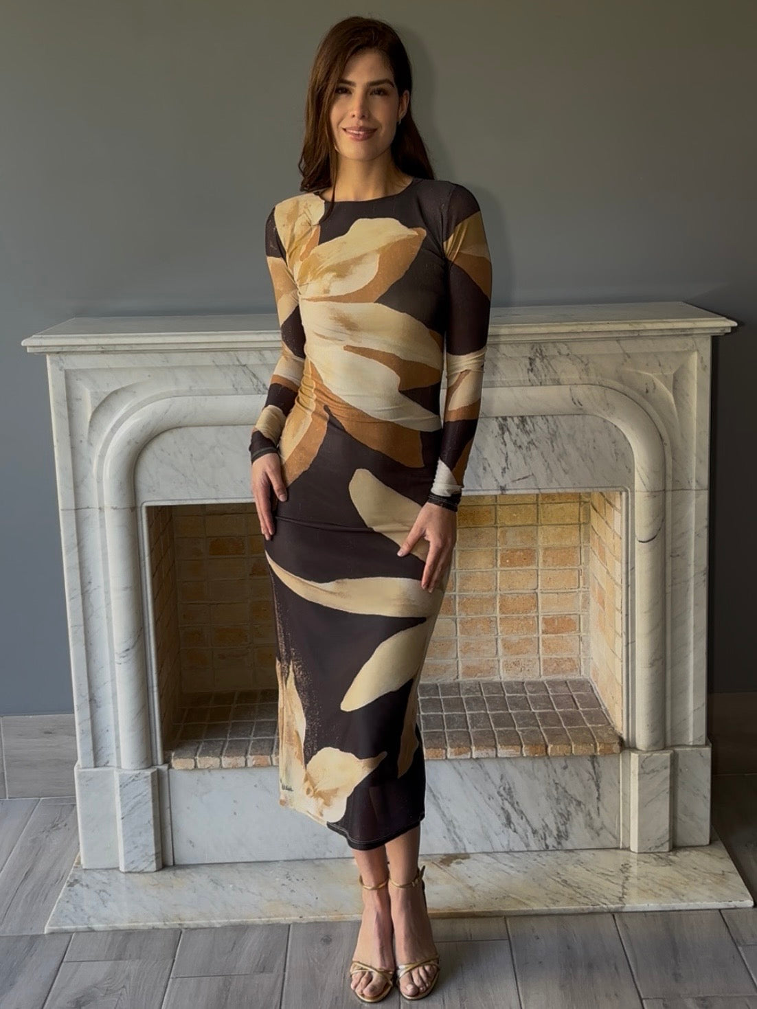 Vestido midi con estampado floral que combina elegancia y comodidad. Confeccionado con mangas largas que proporcionan una cobertura versátil, perfecto para crear looks sofisticados en cualquier ocasión.