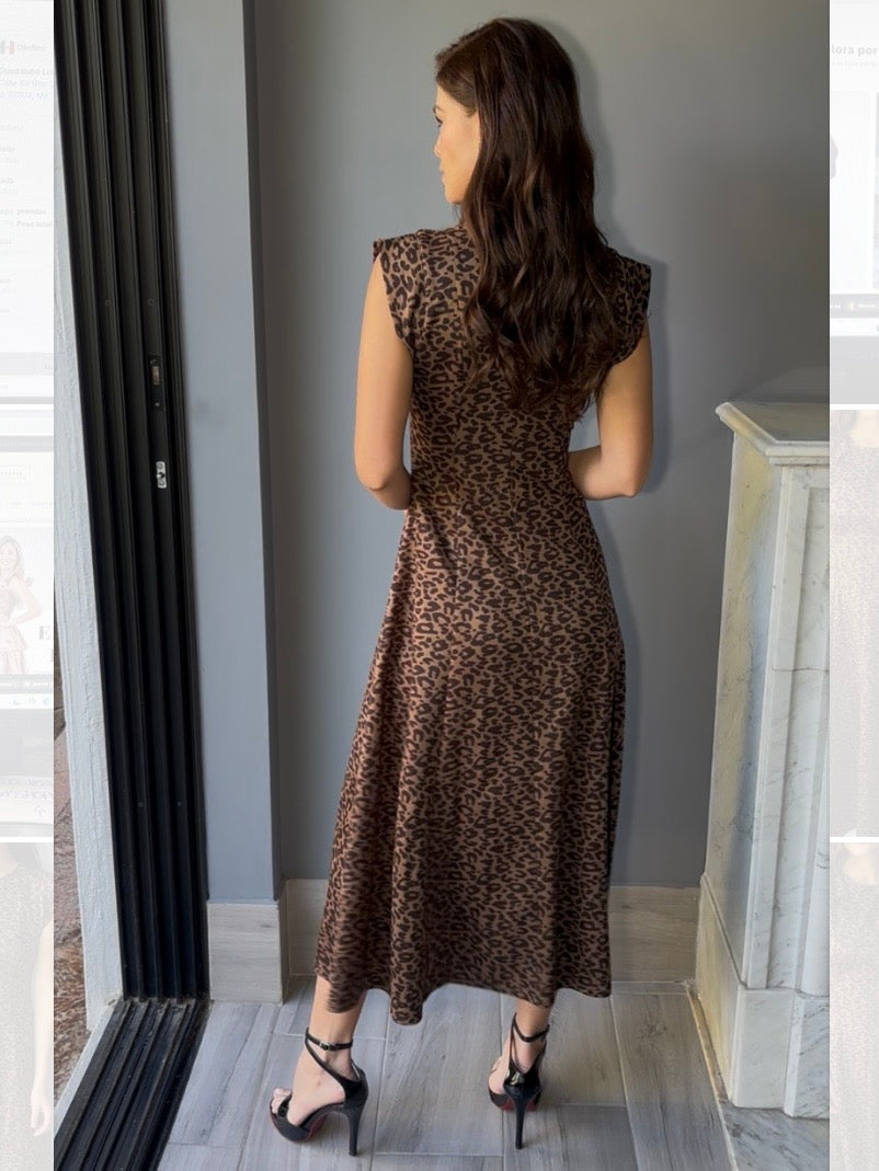 Vestido midi sin mangas con estampado animal print que combina elegancia y comodidad. Diseño en A que favorece la silueta, perfecto para ocasiones especiales.