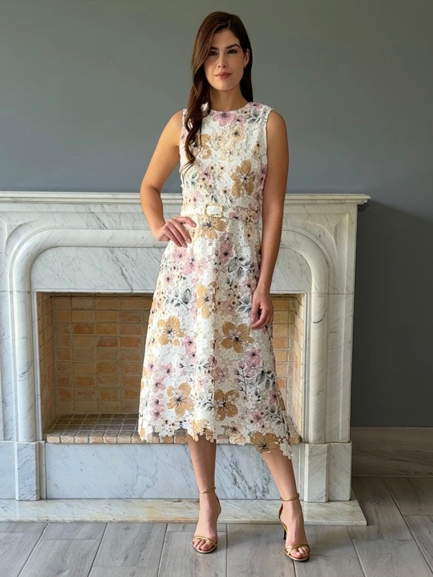 Vestido midi en blanco con un hermoso estampado floral que trae movimiento y elegancia a tu look. Diseñado con un cinto integrado que define la cintura y realza tu silueta. Perfecto para ocasiones especiales. Una pieza versátil que combina con accesorios neutrales o coloridos según tu preferencia.
