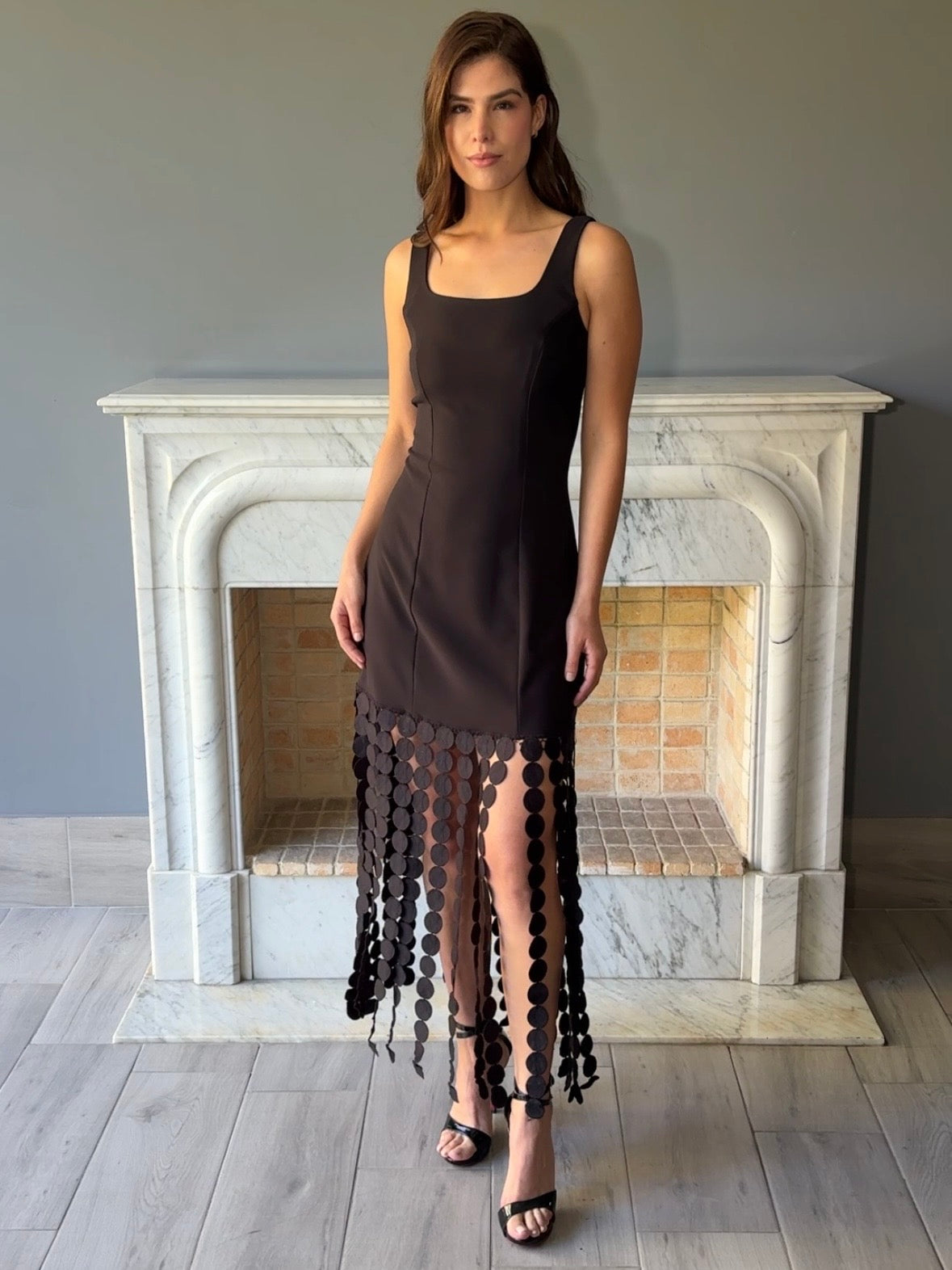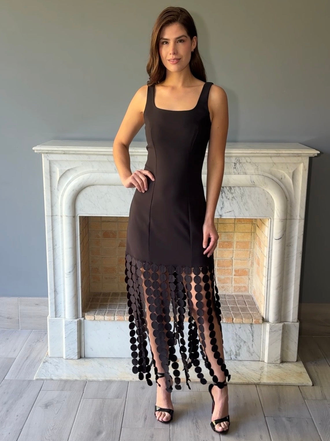 Vestido midi en negro con un diseño único que combina elegancia y movimiento. Presenta una falda confeccionada con tiras decorativas de bolitas que caen suavemente, creando un efecto dinámico y sofisticado.