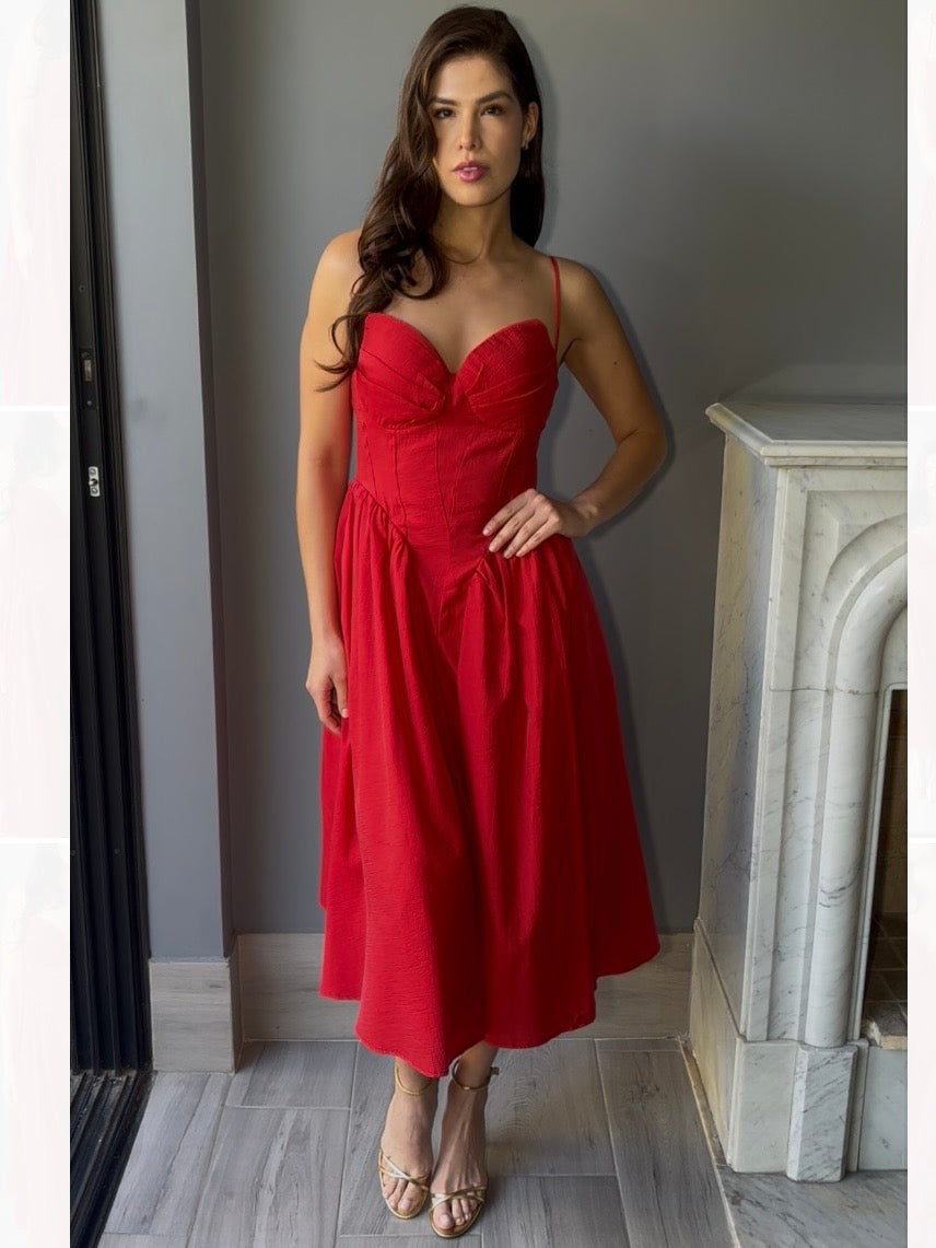 Este vestido midi rojo destaca por sus tirantes finos y un elegante escote de corazón que realza la figura. Su corte en línea A ofrece un ajuste cómodo y favorecedor, perfecto para cualquier ocasión.