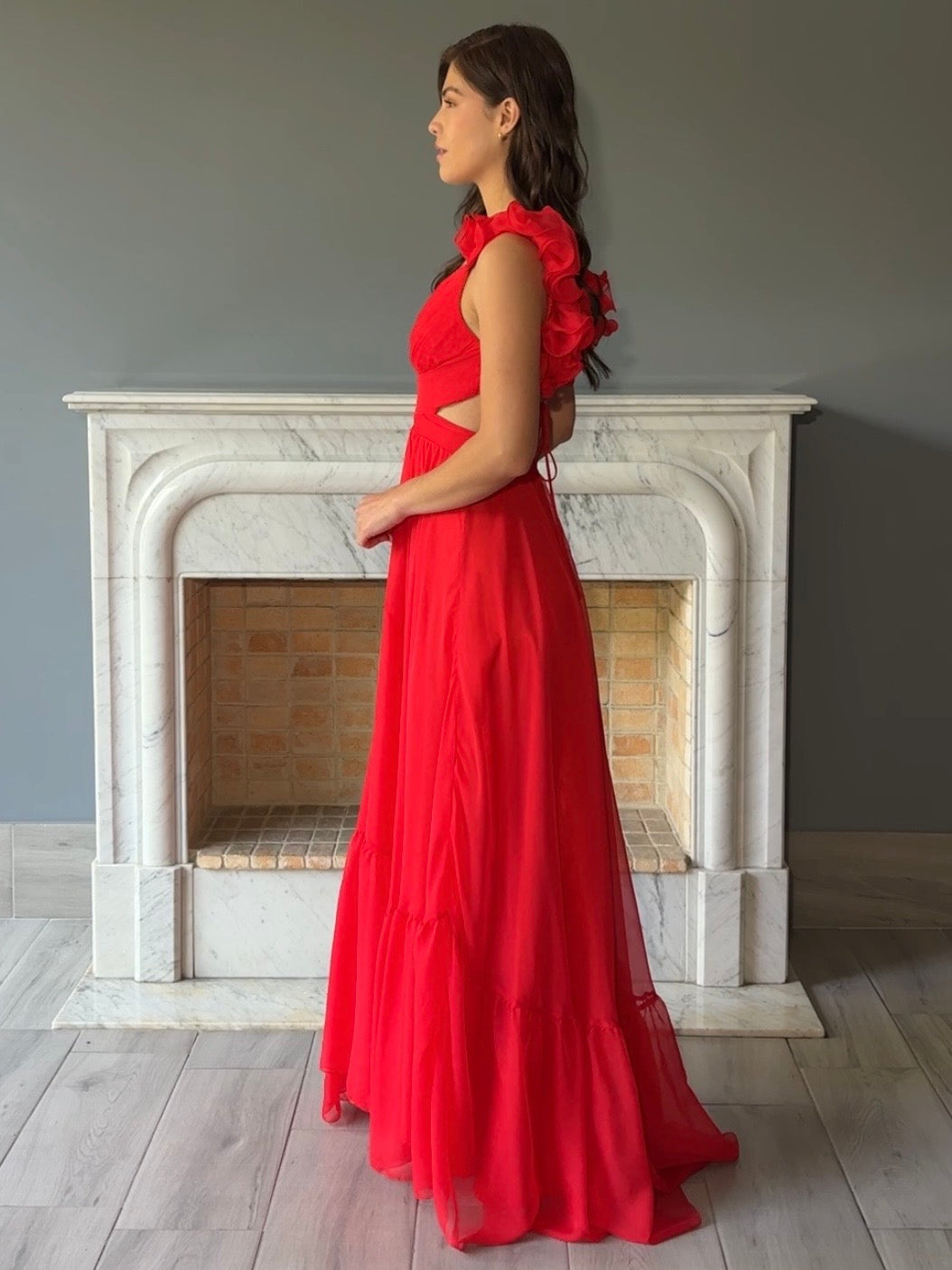Vestido largo en rojo vibrante que destaca por su elegante escote en corazón y volantes románticos en los hombros. La falda de vuelo proporciona movimiento y gracia con cada paso, creando una silueta femenina y sofisticada.