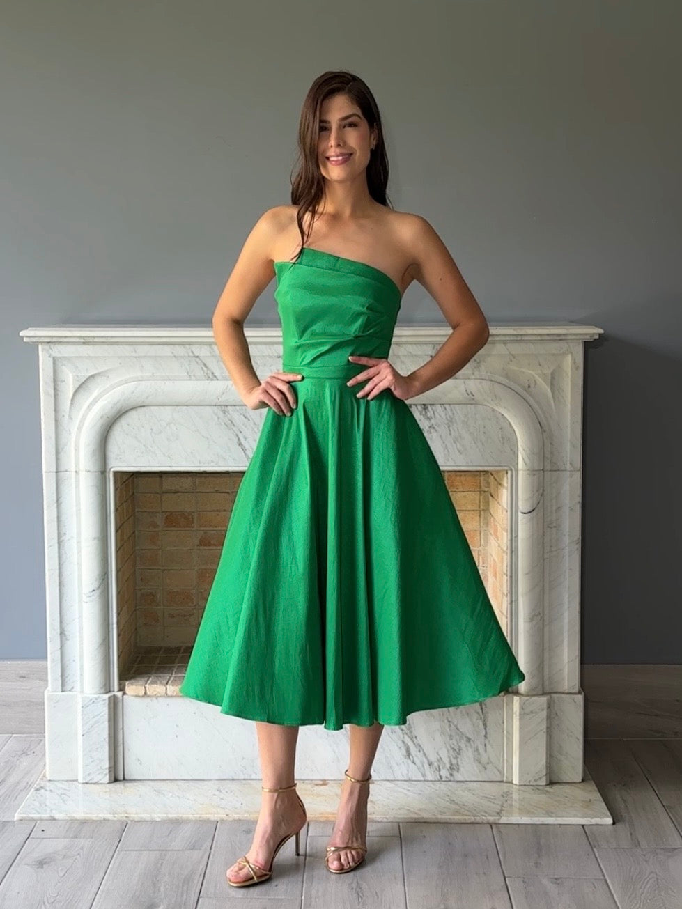 Vestido verde midi con escote estraple y caída en A que ofrece un ajuste cómodo y elegante.