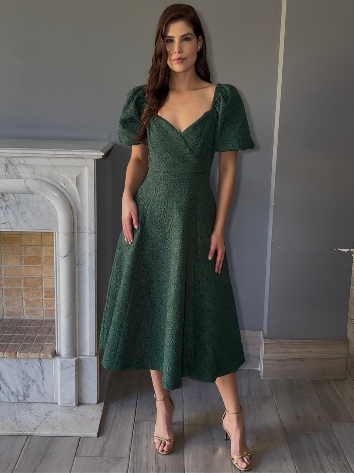 Este vestido midi verde presenta mangas elegantes y un escote en forma de corazón que realza la figura con un toque romántico. Su diseño favorecedor lo hace ideal para ocasiones especiales o eventos casuales donde quieres destacar con estilo y comodidad.